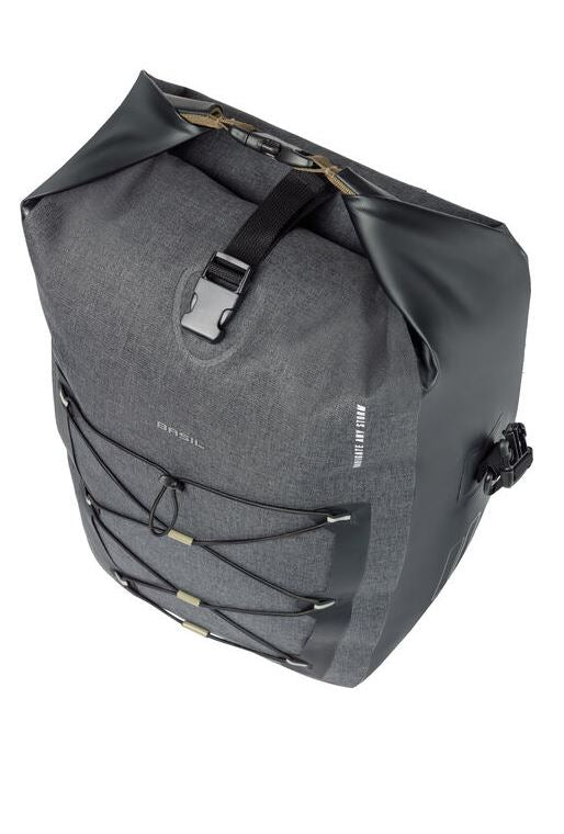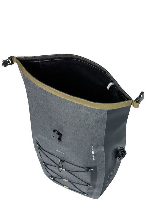 The bag is made of high-quality waterproof (IPX3) fabric. The functional design ensures that this bag can easily carry everything you need. Everything has been thought of to carry your belongings everywhere as practically as possible. Thanks to the adjustable elastic cord, there is also room for your jacket, and the bag can be easily closed with the roll-top closure. This roll-top closure can be attached in three ways. On the road in the dark? No problem! With the reflective Basil logos on 3 sides, you will be visible even then. So you are always prepared for your trip.