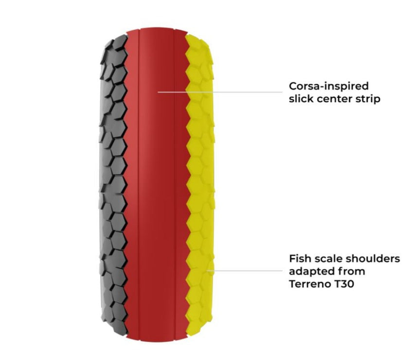 The Terreno Zero’s center strip is adapted from the Corsa road racing line, and its revolutionary fish scale shoulders are adapted from the Terreno Dry gravel tyre. The combination of technologies reduces rolling resistance across the entire contact patch but boosts grip while cornering, riding gravel, or navigating wet conditions. The Graphene-infused compound boosts durability, grip, and speed, and it’s mated to a supple, ultra-durable Endurance nylon casing with added puncture resistance at the center strip and sidewalls.
