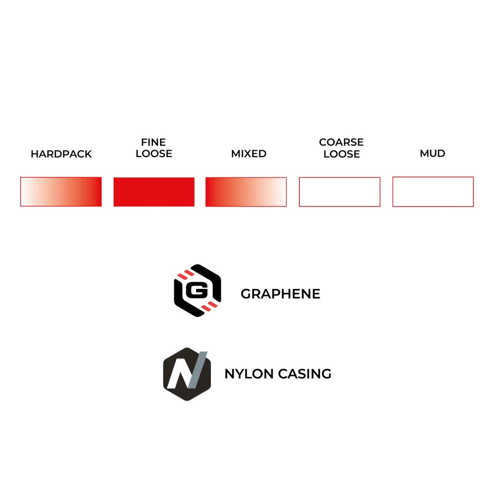 The Terreno Dry’s Graphene-infused compound is more durable, faster, and lighter than rubber alone, and it’s reinforced with the ultra-durable, supple Endurance nylon casing with additional layers of puncture protection on the center strip. The revolutionary fish scale tread pattern is smooth on straightaways and bites while cornering and braking.